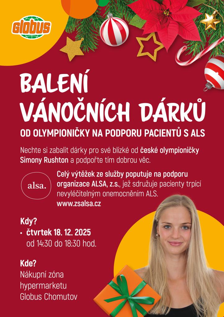 Přijďte si nechat zabalit vánoční dárky od české olympioničky Simony Rushton. Tato akce se koná ve čtvrtek 18. prosince 2025, v čase od 14:50 do 18:50 v nákupní zóně hypermarketu Globus Chomutov. Všechny výnosy z této služby budou věnovány na podporu organizace ALSA, z.s., která se věnuje pacientům trpícím onemocněním ALS. Tímto způsobem můžete nejen obdarovat své blízké, ale také podpořit dobrou věc.