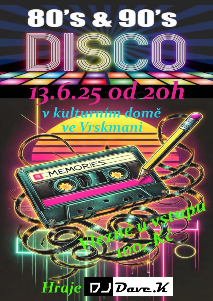 Zveme vás na disco party 80" - 90" let. Dobové oblečení vítáno. Vlezné se platí u vstupu 100,-Kč. Je dovoleno si donést vlastní pohoštění na stůl. Pitný režim zajištěn na baru. Přijďte se pobavit a zatančit si.